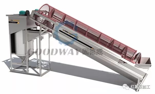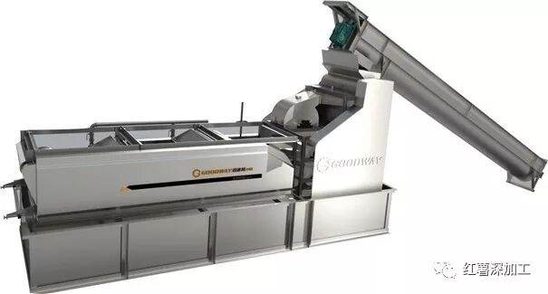 將過磅后的的葛根按先后次序通過清洗輸送機送入清洗除石機進行清洗,主要是清除葛根表面的泥、砂以及其他雜物。生產木薯淀粉時,還必需通過清洗除石機除去木薯塊根的表皮,除皮率要求達到80%以上,而生產葛根淀粉時,無需將葛根的表皮除去。